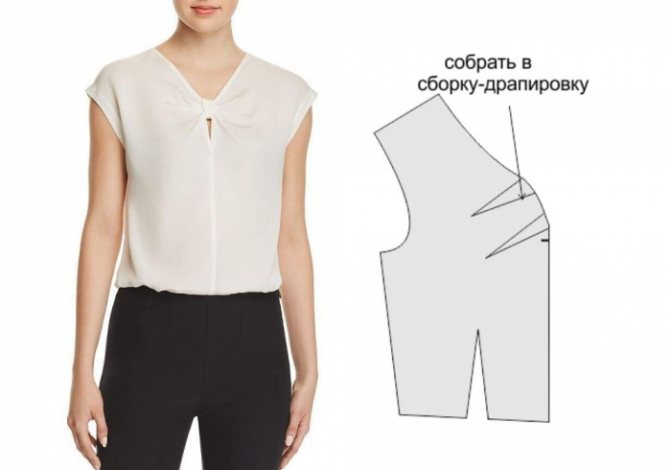 Драпировка расположена в нижней части горловины, перехвачена поперек обработанной вчистую и стачанной в кольцо полоской ткани. Для обработки такой драпировки нужно ввести шов по средней линии полочки.