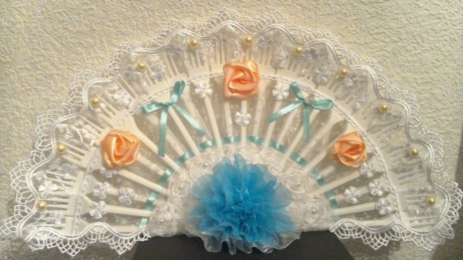 Теперь протаскиваем кружево между зубцами вилок. Создаем из ленточек цветки и банты. Декорируем наш веер цветками, бусинками, бантами на свой вкус.