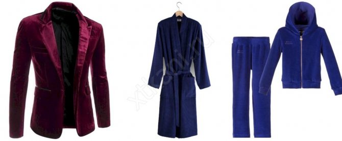 Одежда: платья, юбки, жакеты как для повседневной носки так и для выхода в свет. Домашние халаты, толстовки, спортивные костюмы и детскую одежду шьют из трикотажного велюра. Из шерстяного драпового велюра шью демисезонные и зимние пальто и береты.