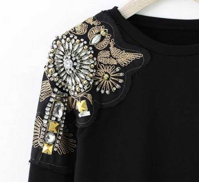 Научившись изображать простой мотив, переходите к работе со стеклярусом, бисером и бусинами одновременно. Красивые узоры из повседневной блузки или платья сделают роскошный праздничный наряд.