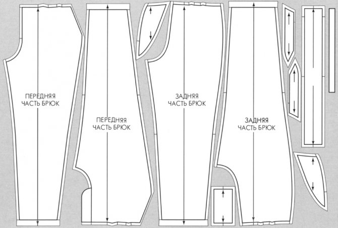 После проведения ВТО ткани, отрез необходимо сложить вдвое по долевой нити. Детали брюк наколоть на ткань таким образом, чтобы линии стрелок располагались по долевой нити. Если на ткани нет направления ворса или рисунка, не требуется совмещение по клетке, детали передней и задней половинок брюк можно разложить в разных направлениях для экономии ткани. Детали пояса, кокеток, подзоры, обтачки, клапаны и другие детали брюк раскладывают в промежутках между основными деталями соблюдая направление долевой нити, намеченное на деталях.
