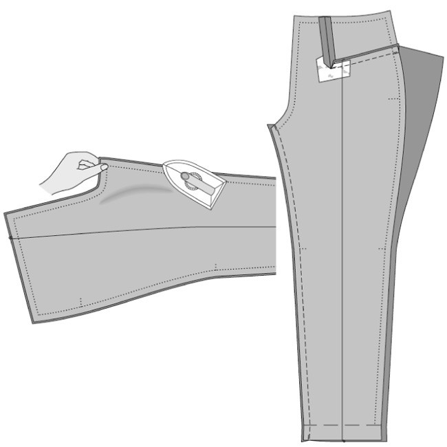8. Сметать и стачать талевые вытачки на задней половинке брюк и заутюжить их в сторону линии сидения.