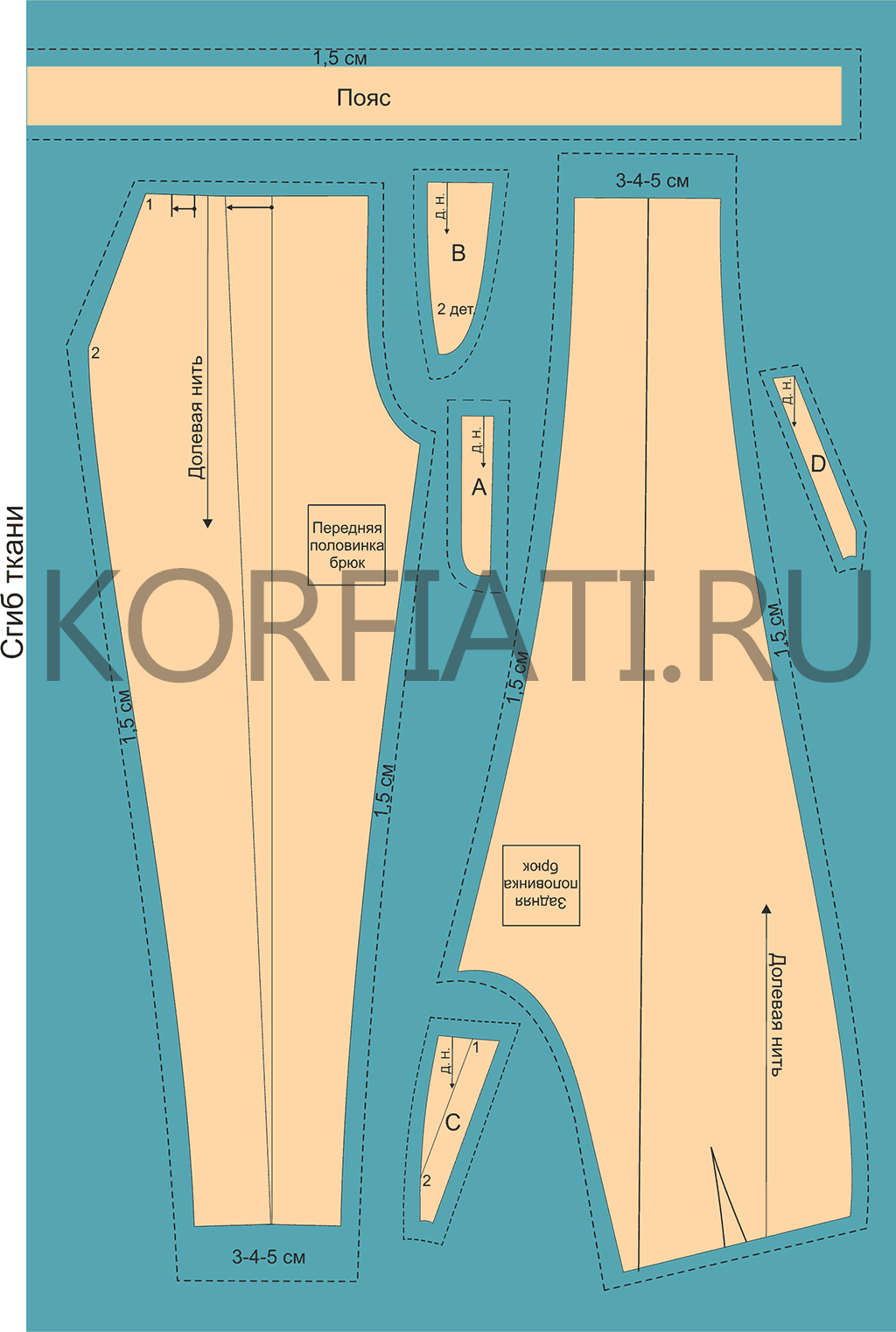 Для тканей с направлением ворса (бархат, вельвет) детали раскладываются на ткани только в одну сторону. Направление ворса должно идти сверху вниз. После окончательной раскладки на ткань всех деталей, их прикалывают булавками, обводят по контуру портновским мелком или специальным исчезающим маркером, размечают припуски на швы – по 1,5 см, по низу штанин – 3-4-5 см (в зависимости от модели), отмечают все контрольные линии, линии стрелок. Затем выкраивают детали по контурам припусков. Сняв выкройку, проводят контрольные линии полностью и переносят их на лицевую сторону наметочными силками.