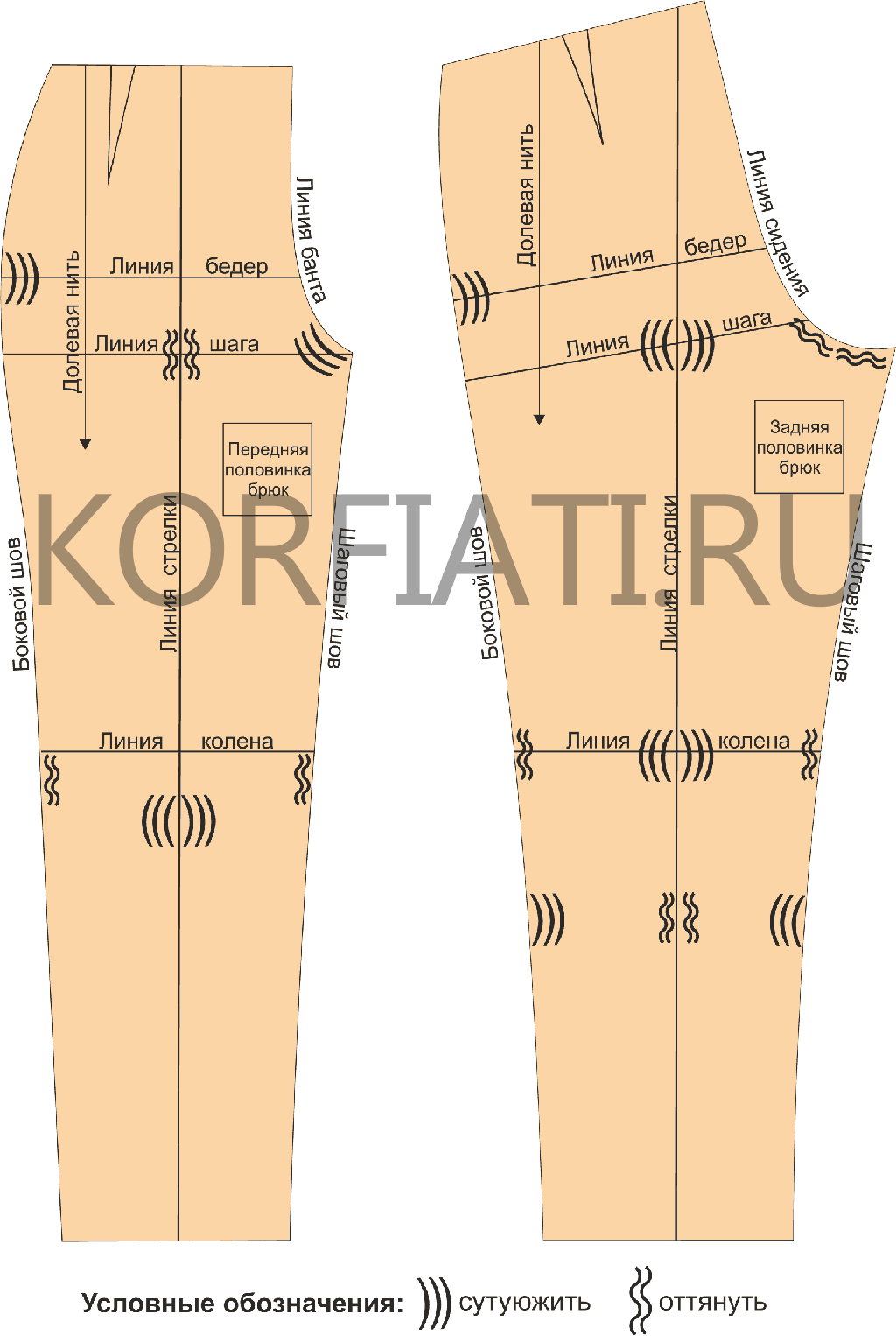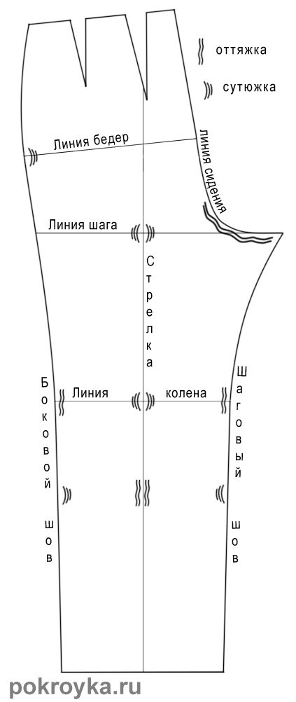 Примечание. Линия заутюжки в задней половинке брюк, в зависимости от чертежа, выкладывается, начиная от линии колена вверх до талии – как ляжет. Исключением могут быть ткани в полоску, клетку. Здесь стрелка идет по этим линиям.