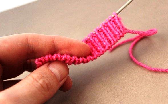 По окончанию ряда оставляем нить хвоста — она нам больше не понадобится. Следующий ряд вяжем лицевыми петлями только нитью от клубка. Последний ряд набора: над петлями предыдущего ряда вывязываем изнаночные, из протяжек между ними — лицевые.