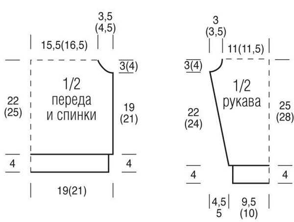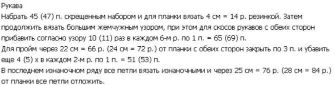 Одновременно прибавить для скосов рукава с обеих сторон на расстоянии 1 п. от края в каждом 10-м р. 6 х 1 п./в каждом 10-м р. 4 х 1 п. и в каждом 8-м р. 4 х 1 п./через 10 р. 1 х 1 п. и в каждом 8-м р. 9 х 1 п./в каждом 10-м р. 4 х 1 п. и в каждом 8-м р. 7 х 1 п./в каждом 8-м р. 10 х 1 п. и в каждом 6-м р. 5 х 1 п. = 62/68/74/80/90 п.