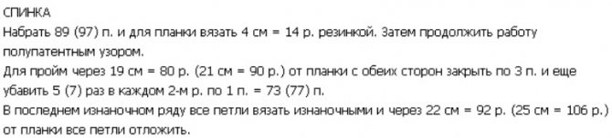 - Схема работы над спинкой аналогична передней части свитера. Разница лишь в том, что формирование горловины начинается одновременно с плечевыми скосами на высоте 45 см.