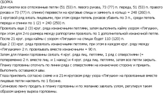 втачать рукава по линиям реглана (более короткая сторона реглана рукава соответствует реглану переда). Выполнить швы рукавов. Выполнить боковые швы, оставив свободными планки в резинку. Открытые петли планки горловины прикеттлевать по лиц. стороне работы к вырезу горловины.