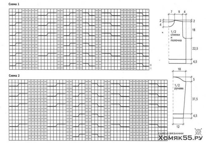 - Вязание рукавов начинаем с 4,5 см резинки. Чтобы они были свободными, делаем равномерное прибавление 8 петель в последней полоске. Используем схему 2.