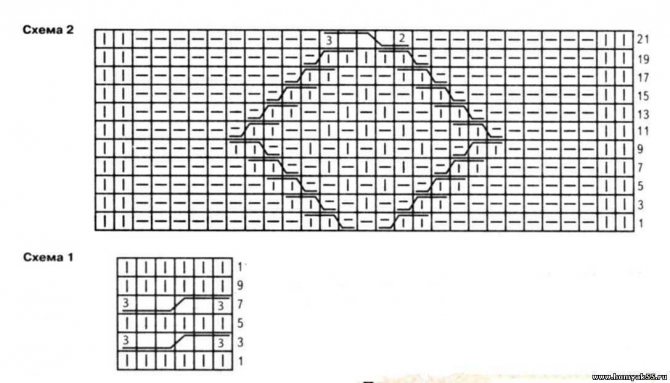 - Узор 1 и узор 2 приведены на фото ниже. Причем на фото изображены лишь лицевые полоски. С обратной стороны продолжайте рисунок.