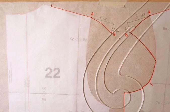 Продлеваем плечевую линию. Откладываем по ней от крайней точки 5 см.