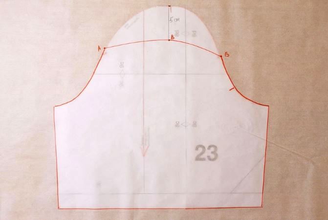 - отступить 20 см от верхнего сгиба – это метка линии проймы. Её надо соединить с низом плавной линией;