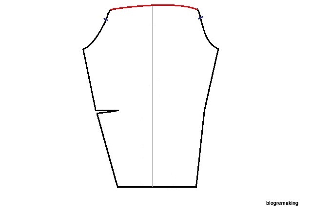 Сделать расширение горловины, отмерив от высшей точки плеча 2 см. Эта величина выбирается по желанию, вы можете вообще не увеличивать ширину выката.