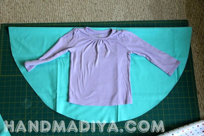 На материале, сложенном по диагонали, нужно построить полукруг, диаметр которого равен длине рук, измеренной от одного запястья к другому. Выкраивается горловина, делается разрез спереди, по необходимости чертится на оставшемся лоскуте капюшон. Дальнейшие действия – стачать наголовник, вшить его, обработать срезы, выполнить подгибку. Девочка будет в восторге, если мама выберет ткань по её вкусу. Нравятся ей цветочные мотивы или она хотела бы видеть героинь мультфильма, прислушайтесь к желаниям ребёнка.