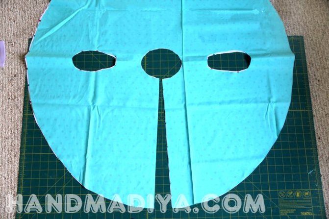 Затем открываем один разворот ткани, чтобы получился полукруг. Затем работаем с горловиной. Чтобы не промахнуться с ее размером, лучше взять какое-то изделие, которое вам больше всего подходит, и приложить его к полотну. По контуру горловины вырезать полукруг.
