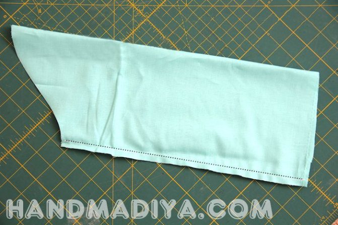 Измеряем расстояние от шеи до запястья по линии руки. По верхнему сгибу полотна от горловины отмеряем полученное расстояние. Делаем отметку мелом. Проводим плавную округлую линию от точки, где будет запястье, до точки середины нижнего края. Отрезаем лишнюю ткань.