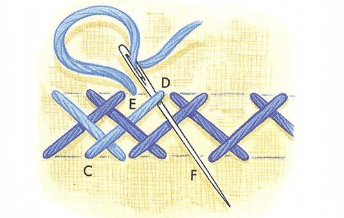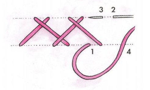 - Делается один стежок назад иголку, игла выводится в место первого прокола.